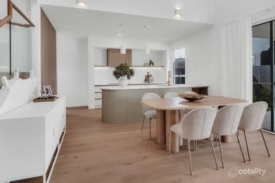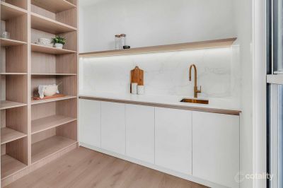 Light-filled open-plan living and dining areas capture serene water and skyline views, flowing seamlessly to a waterfront alfresco terrace ideal for relaxed entertaining. The designer kitchen features stone benchtops, premium appliances, and elegant finishes, forming the heart of the home.